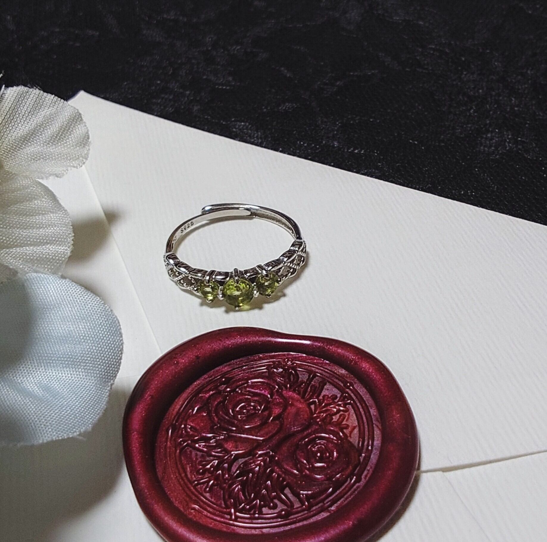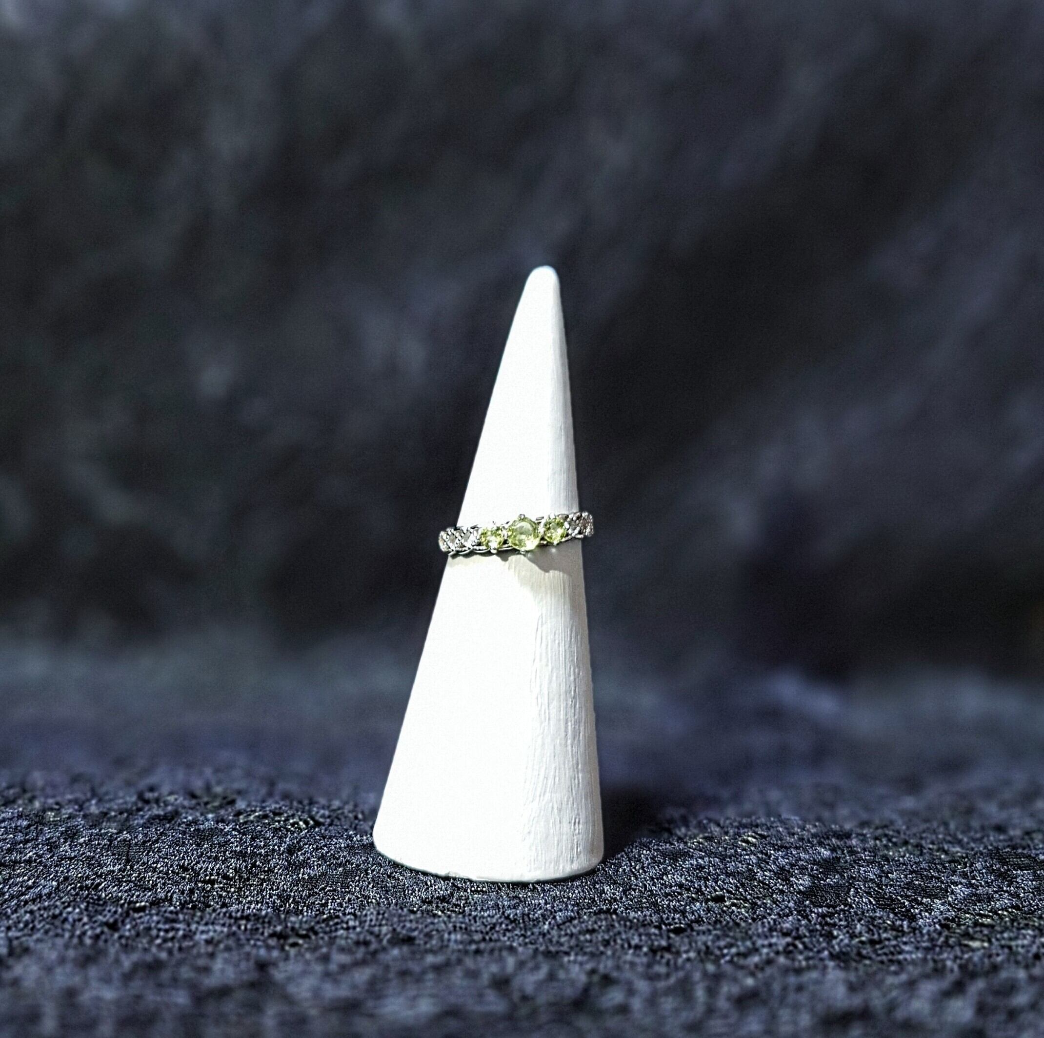 やわらかな光を帯びた3つのペリドットを、ドレスのように編まれた細工に添えて。