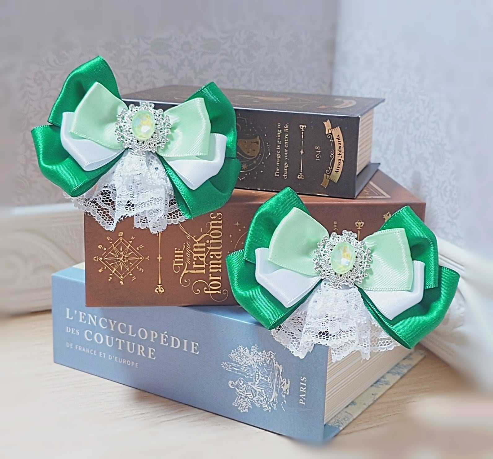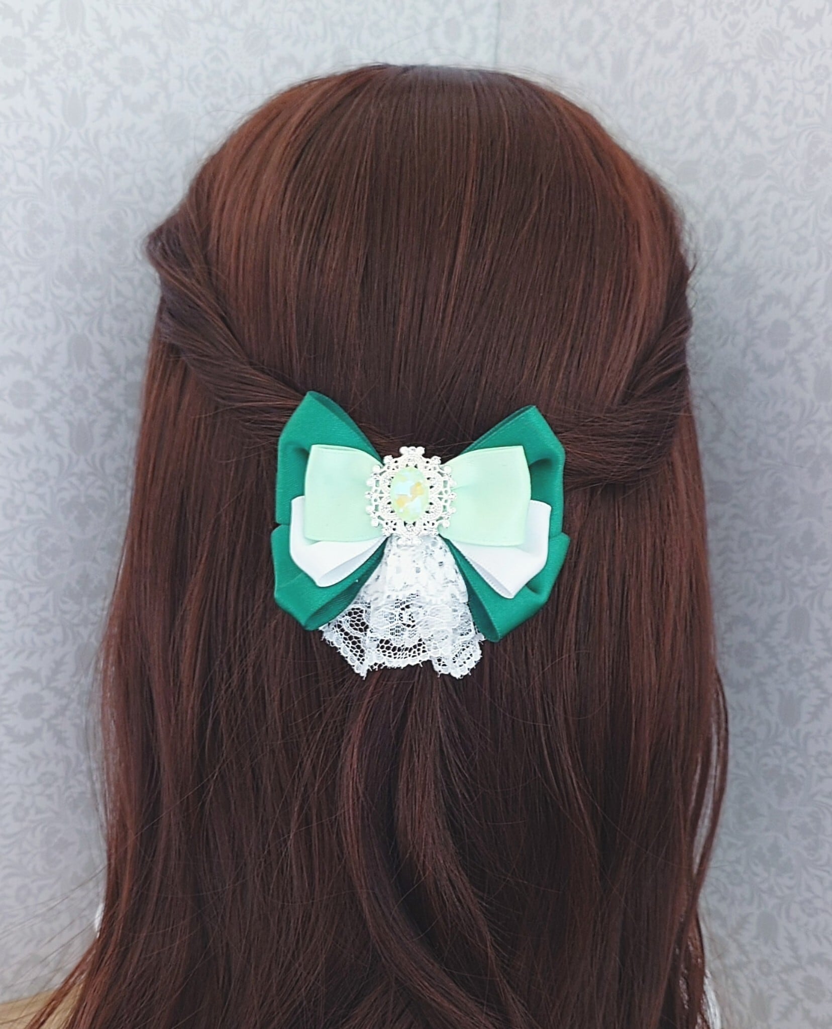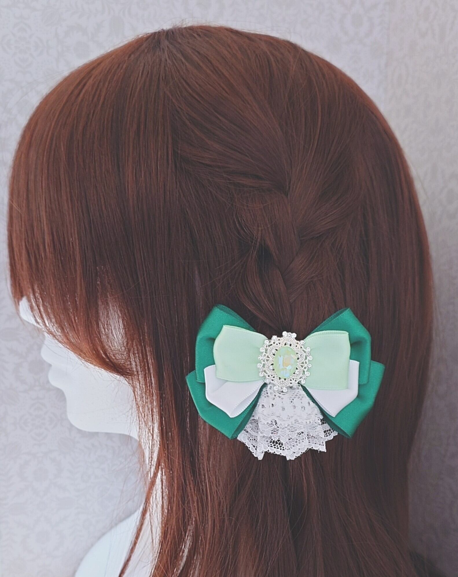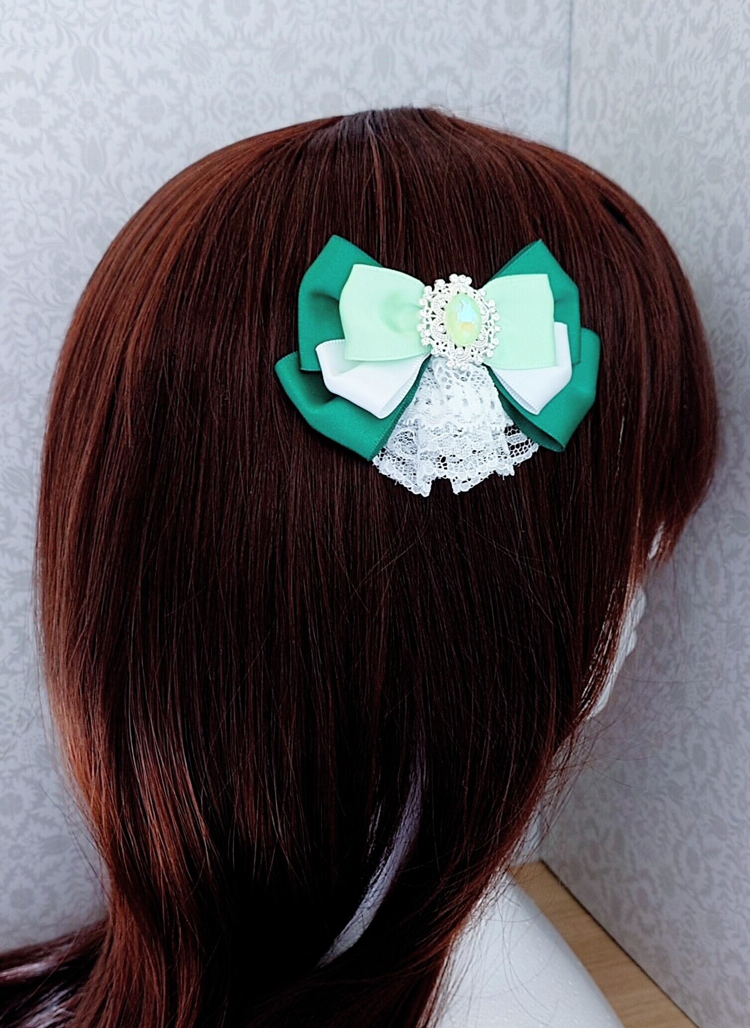 装着方法:スリーピンでお好きな場所に付けられます。結んだ髪のゴム隠しにも◎